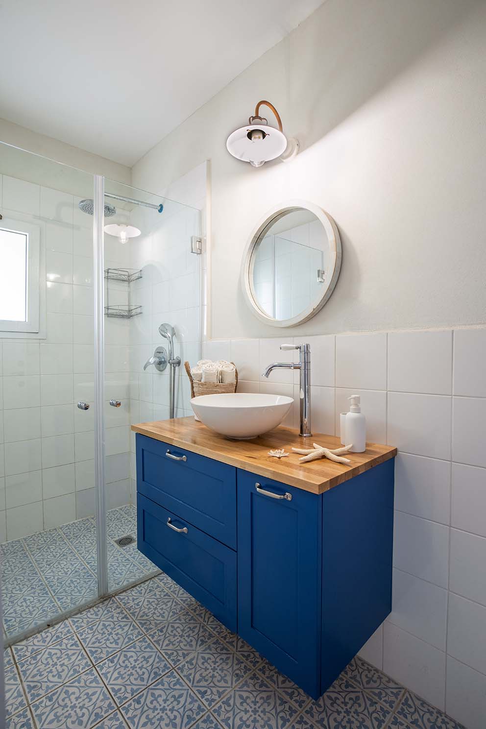 בחדר הרחצה של ההורים ארון כיור בגוון "כחול יוון", המשולב עם אריחי דקור בדוגמה אוריינטלית בצבעי תכלת-לבן מהווים תזכורת לחופשה החלומית שחוותה המשפחה בקיץ אשתקד. בשל העובדה שחלל הרחצה הכללי גדל, ע"י "דחיפת" הקיר החוצץ בינו לבין אחד מחדרי השינה, נוצר מצב שהקיר שזז אינו תומך יותר בבוידעם שמעל. המצב הצריך הכנסת עמוד תומך והיינו שם מאוד מאוד גבוליים בגלל הפתח לחדר השינה, שהיה שם ולא ניתן היה להזיזו הצידה. בסופו של הצלחנו להטמיע את העמוד ללא כל רמיזה על מיקומו.
