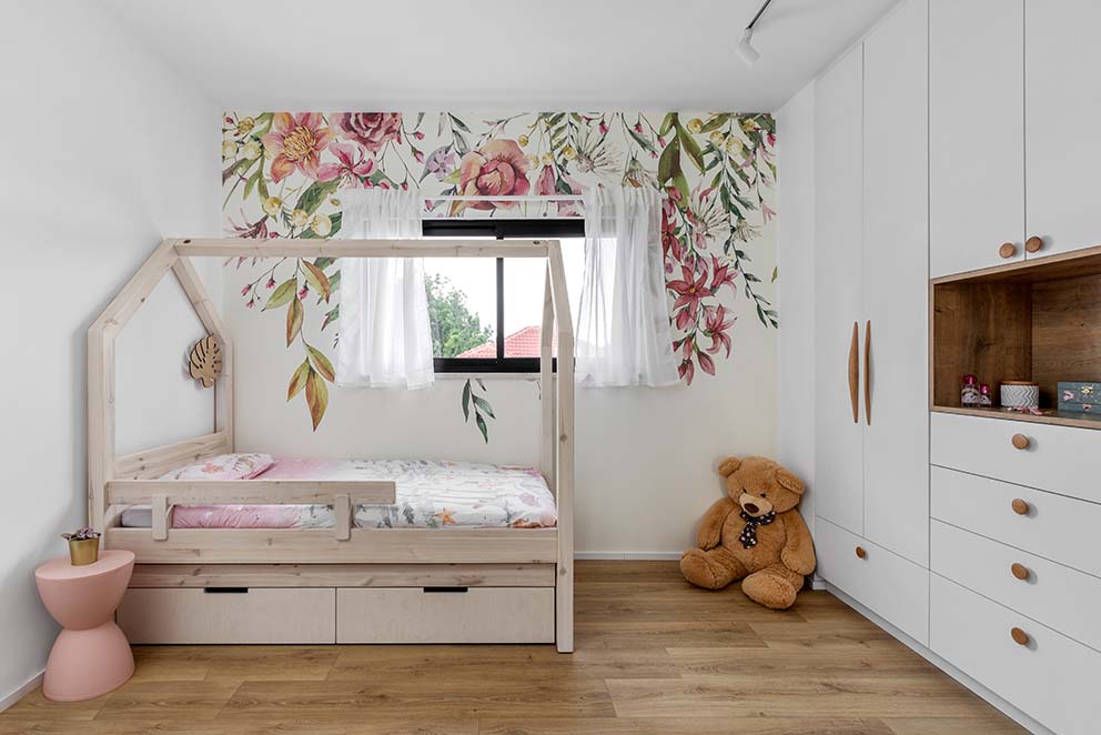 גם את קומת הילדים בחרנו לעצב בגוונים בהירים ועץ אלון. שילבנו צבעי פסטל מעודנים בתמונות, בשטיחים, בצבעי הקירות בחדרים ובאריחי חדרי הרחצה. את הספרייה בפינת הטלוויזיה ואת ארונות הבגדים בחדרי השינה תכננן בנגרות בהתאמה אישית ובחרנו עבורם בגוונים בהירים.